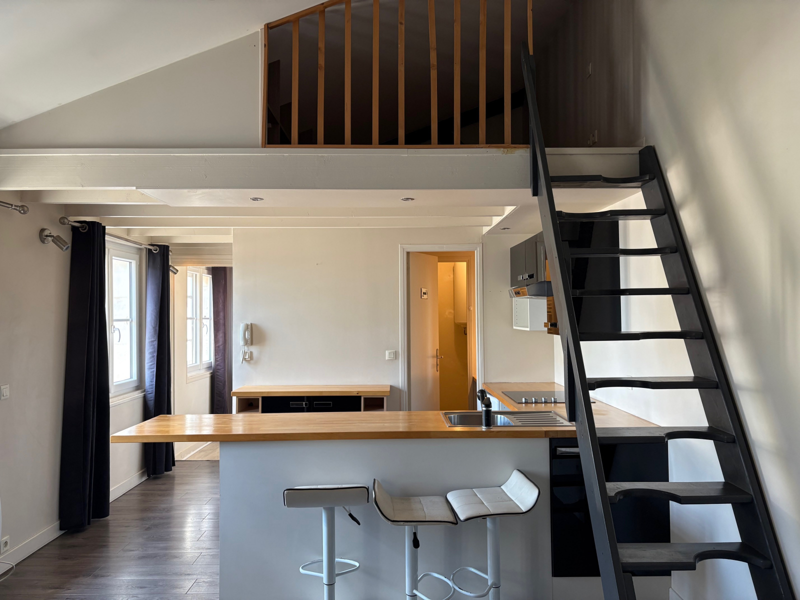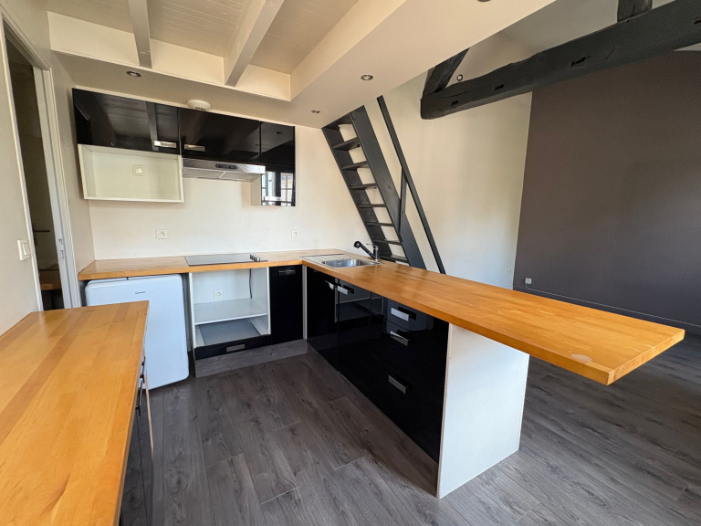 Proche parking gratuit, en centre ville, dans Hôtel Particulier, second étage, beau Studio de 27.72 m² + mezzanine : entrée & placard, pièce de vie parquet avec belle cuisine américaine (comptoir, éléments, plaques vitro, hotte...), jolie sd'eau avec wc. Espace couchage sous-rampant - Belles prestations - cour commune - Libre 6 AVRIL 2026 - loyer mensuel hors charges : 430 euros + 20 euros (électricitié et entretien commun) eau en sus (compteur individuel - dépot de garantie : 430 euros - F.Ag 200€ ttc (etat des lieux inclus)
